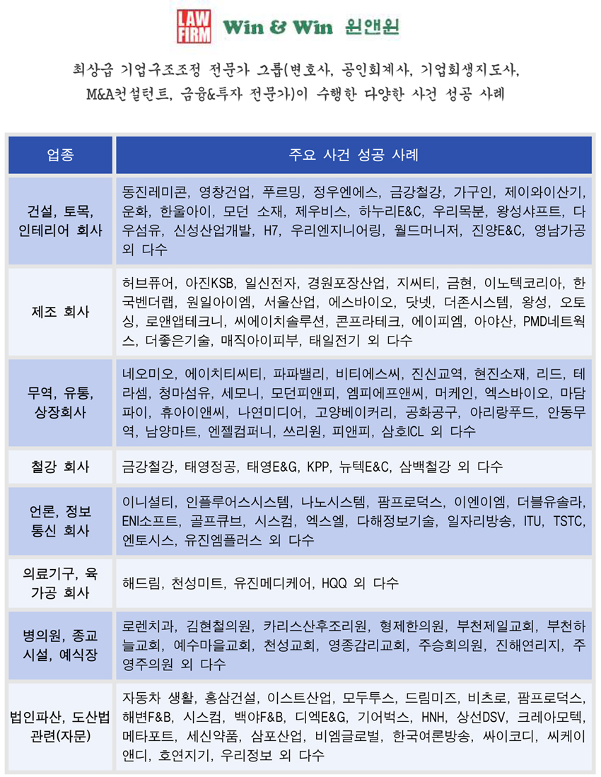 기업회생은 "죽을 것 같을 때" 찾는 마지막 구명조끼 같은 제도이다. 너무 늦게 신청하면 회생 가능성 자체가 떨어지기 때문에, 유동성 이상 징후(현금소진 속도 가속, 이자보상비율 1 미만 지속 등) 가 보이면 즉시 전문가 또는 전문 로펌의 구조조정·턴어라운드 디렉터 또는 오케스트레이터(예: 로펌 윈앤윈 노현천 소장)과 상의해 회생 신청 시점을 전략적으로 잡는 것이 가장 중요하다.